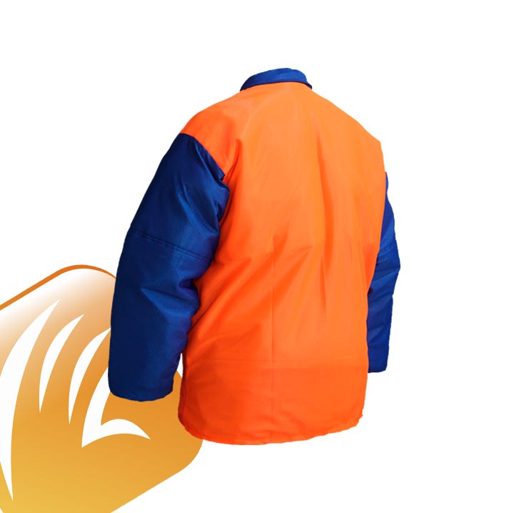 Confeccionada em tecido 100% poliéster, costurado conjuntamente com 8 camadas de fibras de proteção interna, mais forro, protege o tronco e membros superiores contra acidentes com motosserras.