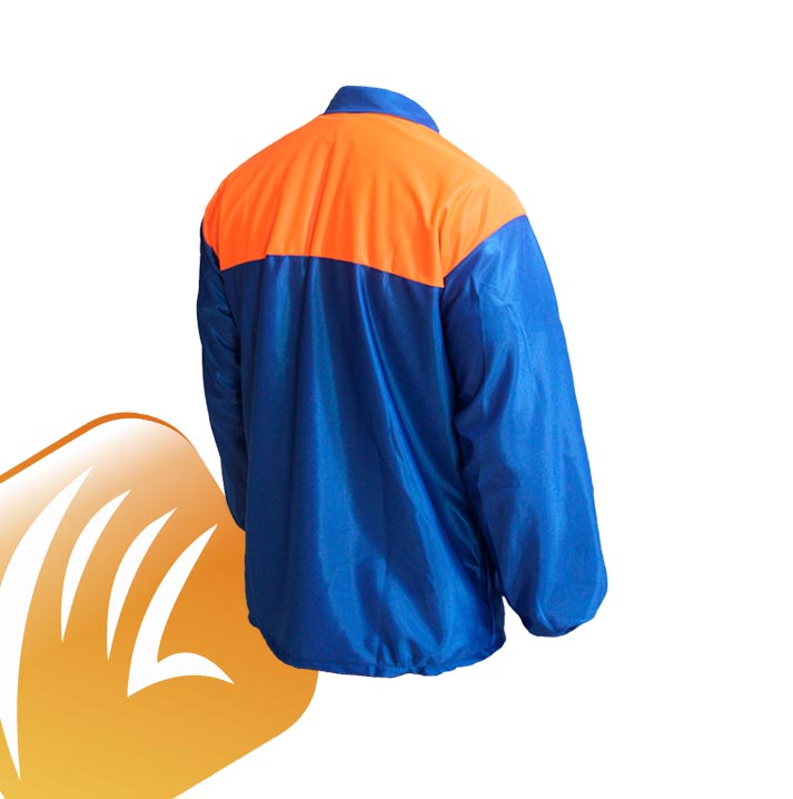 Confeccionada em tecido 100% poliéster nas cores azul e laranja.
