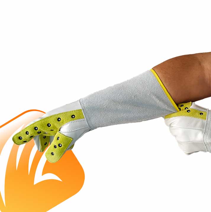 A luva é confeccionada em vaqueta na palma e dorso reforço na palma e nos dedos em vaqueta e externo com aplicação de ilhós. Tira de vaqueta entre polegar e indicador, punho 20cm em raspa, forração interno na luva e punho, costurada com linha de nylon e acabamento na borda do punho em viés.