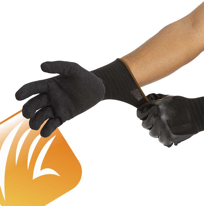 Luva de segurança, tricotada com fios de poliamida, sem costura, revestida na palma, face palmar e pontas dos dedos com poliuretano, punho com elastano, formato anatômico.