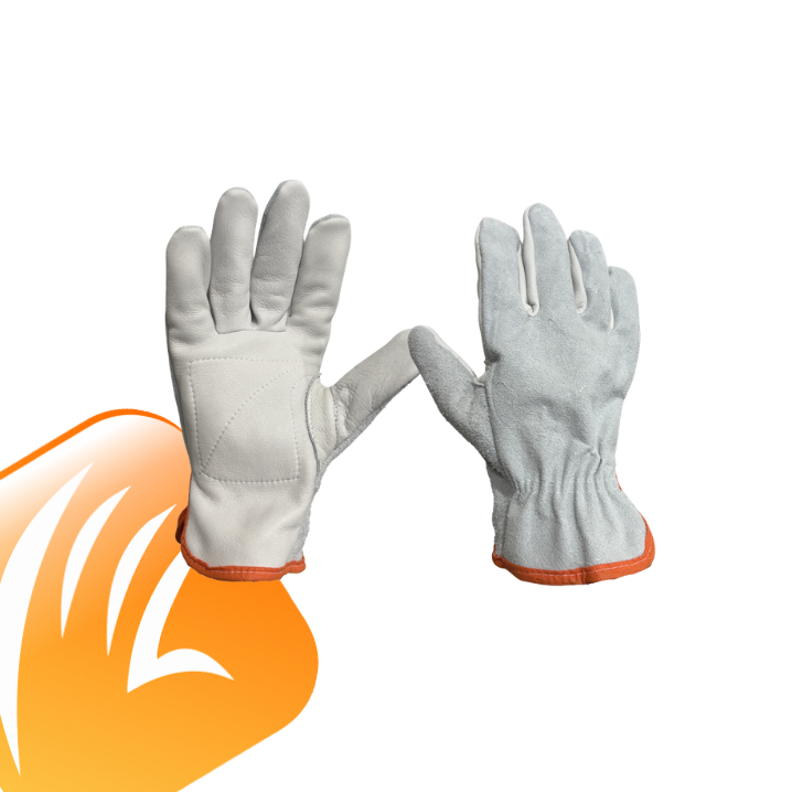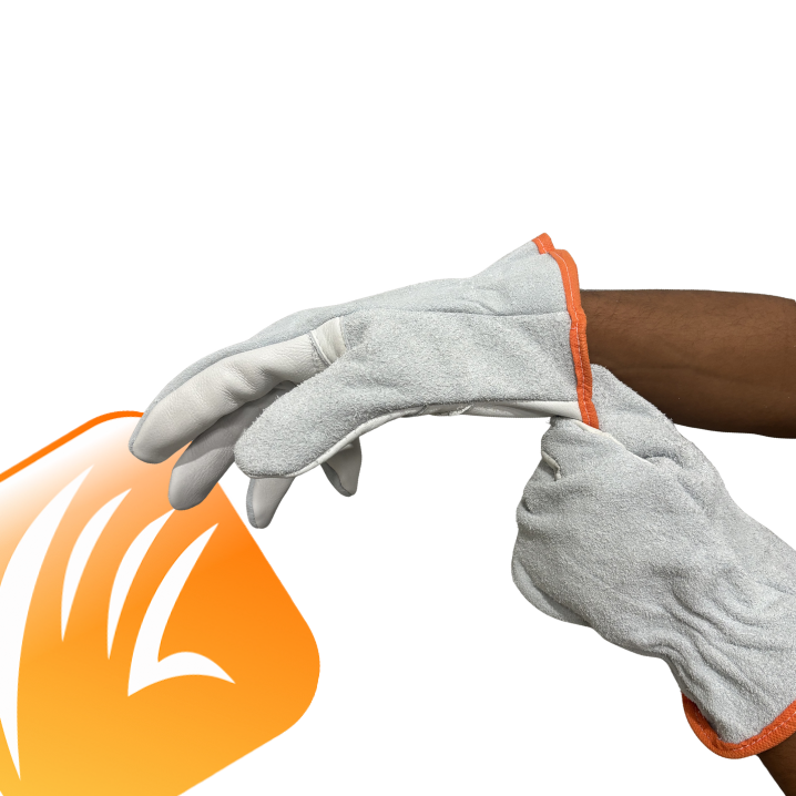 Luva de segurança confeccionada em vaqueta na palma, face palmar dos dedos; raspa no dorso e face dorsal dos dedos; reforço na palma, costura em linha de nylon, com acabamento em viés.