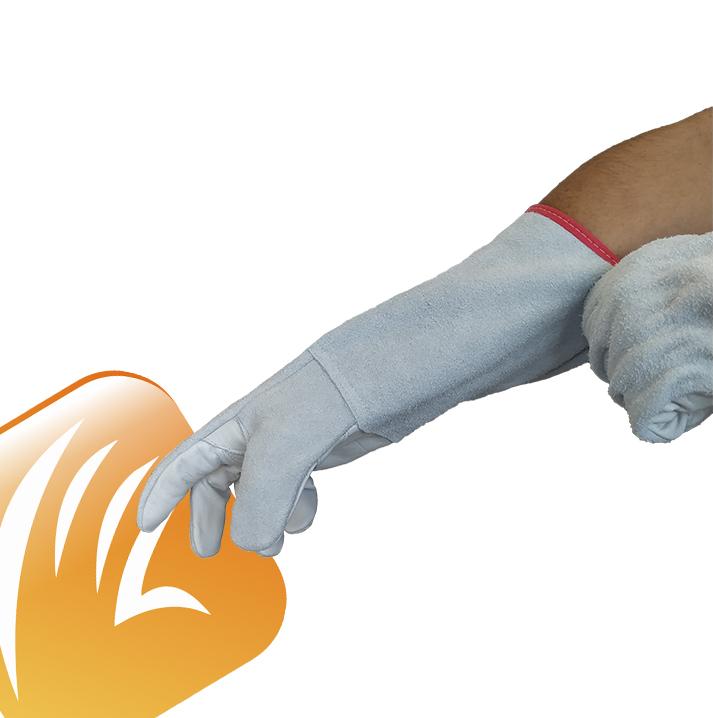 Luva de segurança confeccionada em vaqueta na palma, face palmar dos dedos; raspa no dorso e face dorsal dos dedos; reforço na palma, costura em linha de poliéster, punho 20 em raspa com acabamento em viés.